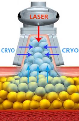 2) The fat cells in target area begin to freeze. No damage is caused to nerves or tissue because lipids in fat crystallise in warmer temperatures then water in other cell types